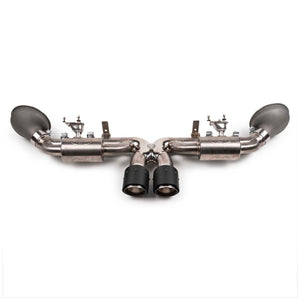 The Fabspeed Motorsport USA Valvetronic Titanium Cat-Back Exhaust System gives the 992 GT3/ GT3RS a truly exotic sports car sound, all while retaining the functionality of PSE (Porsche Sport Exhaust). Our design process started with 3D scanning the entire OEM exhaust system using our CREAFORM 700 Handscan so that we could make a complete Solidworks 3D model of the exhaust. We then designed the exhaust and fixtures using that model so that the exhaust fit perfectly to OEM standards. After multiple revisions for maximum flat 6 GT3 high pitched sound quality and real dyno development and repeated dyno testing, we decided to use our signature cast 70mm 2.75" X-Pipe to tie the two cylinder banks together for exhaust scavenging and to defeat resonance. The exhaust valves are made by Helical Limited in the United Kingdom. These ISO 9001-certified valves are the same ULTIMATE QUALITY exhaust valves as used by Ferrari, McLaren, Aston Martin and Porsche use on their GT cars. The piping is mandrel bent from 1 piece Titanium with minimum welding points. NO rediculous stupid PIE cuts or multiple lobster tail welds that is indicative of poor quality and cheap labor no CNC mandrel bending equipment. With Fabspeed you have five different tip options to choose from.